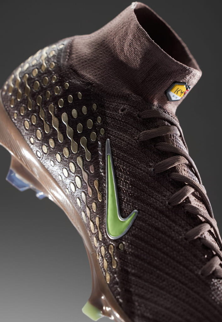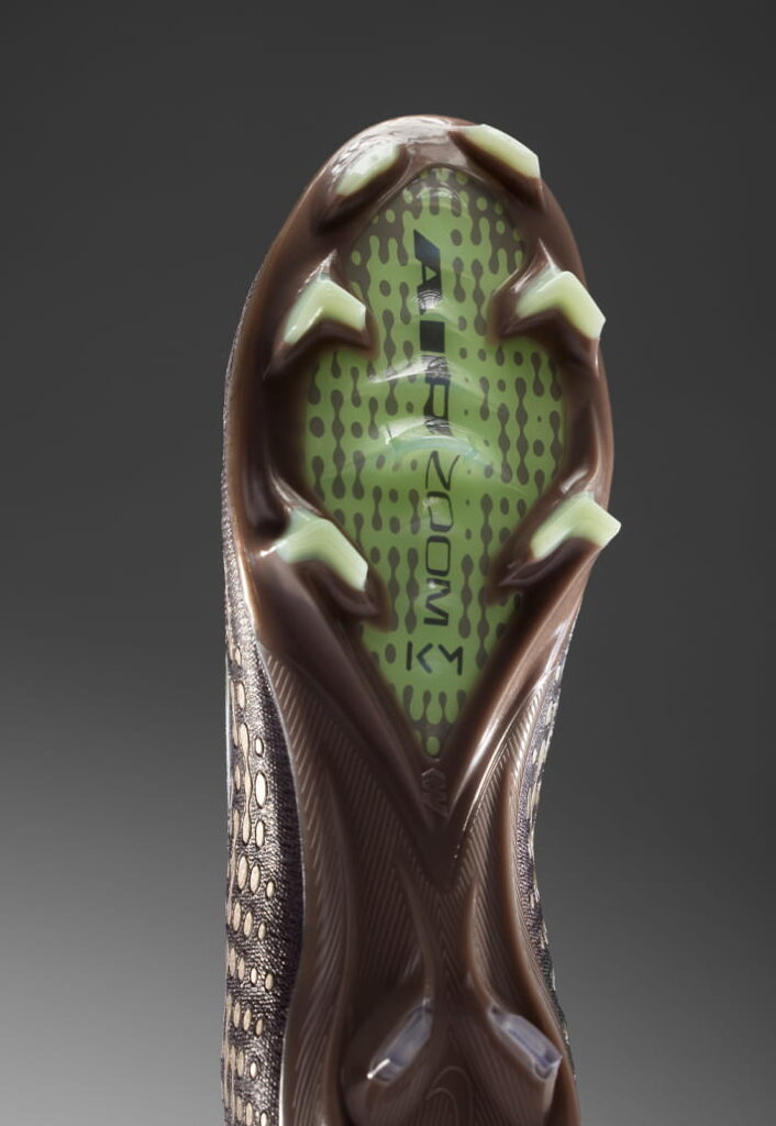 La estética se ubica ahora en un terreno más frío, más calculado, con una base en marrón topo apagado sobre el que aparecen tonos como un lima eléctrico o un plateado metalizado que convierte la propuesta en un lanzamiento elegante pero profundamente contemporáneo. Este plateado ejerce un papel de materia líquida que parece derramarse, efectos cromados que remiten directamente al movimiento. Además, detalles como el logotipo «KM» sobre la lengüeta terminan de cerrar la narrativa.